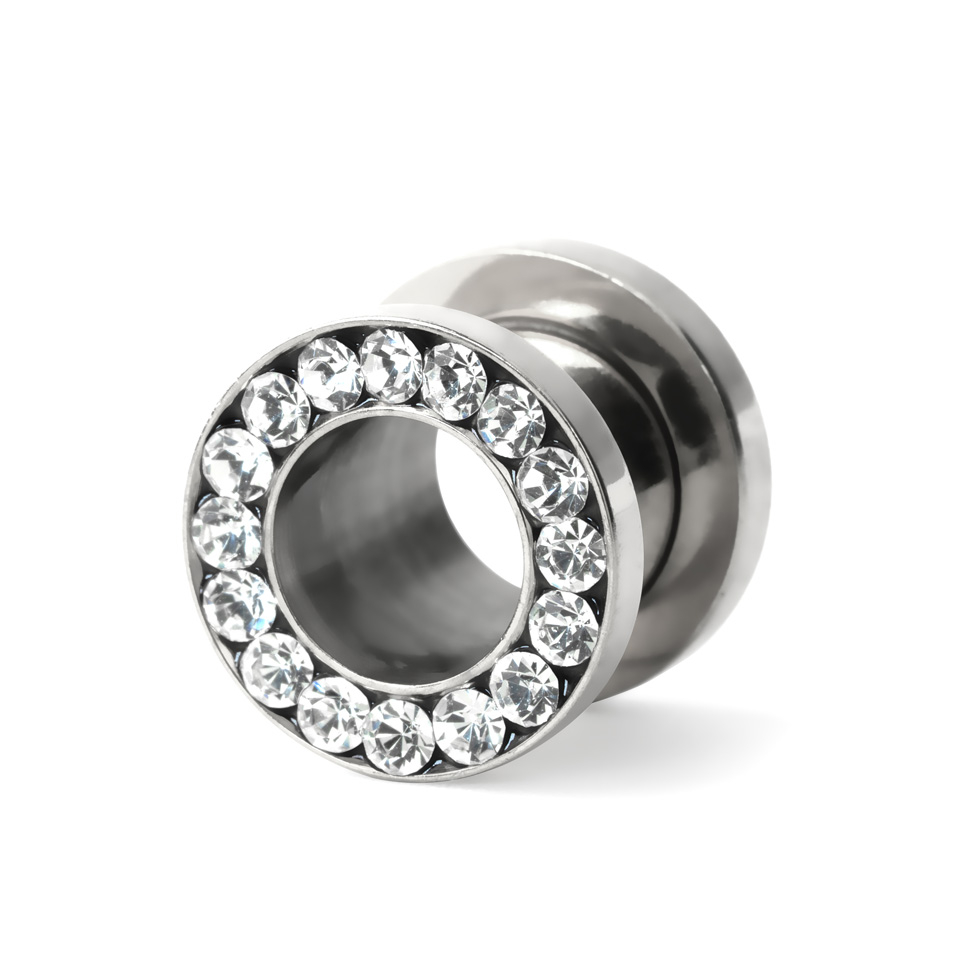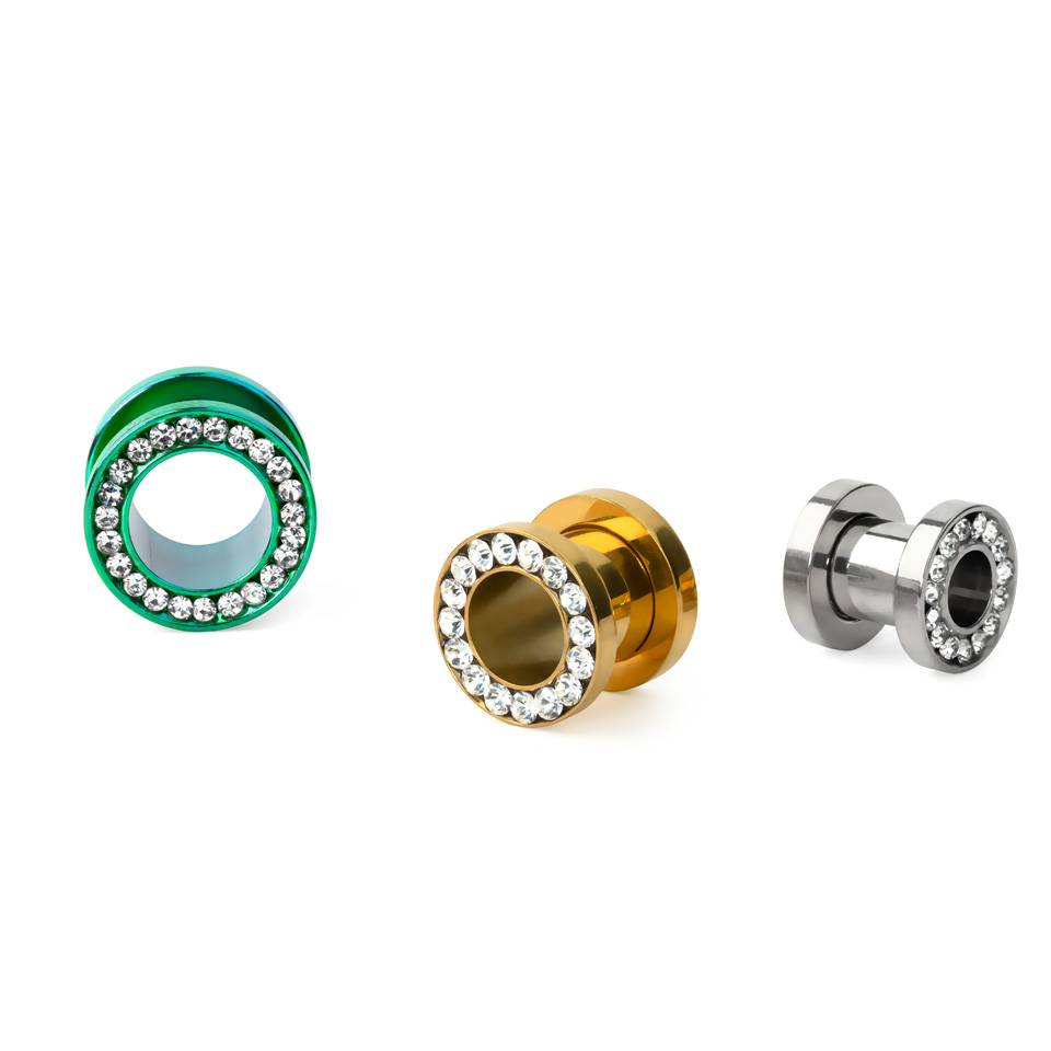 Lækker klassisk tunnel som er fremstillet af kirurgisk stål og som her fås i et væld af forskellige størrelser samt farvesammensætninger. Fælles for alle modellerne er at de er tæt besat af små facétskårede sten hele vejen rundt i kanten, hvor de sidder i en perfekt cirkel og funkler smukt når lyset rammer dem. Der er virkelig lidt for enhver smag samt næsten alle størrelser stretch her.