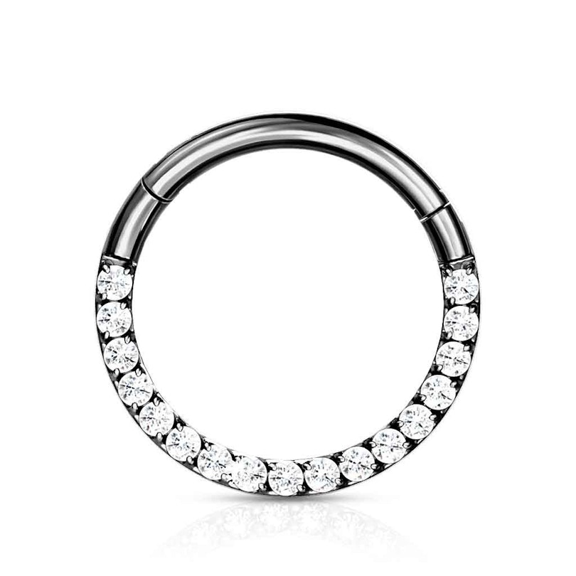 Den forreste del af ringen har en række med funklende sten. Du skal overveje placeringen af stenene alt efter hvilken piercing du vil have ringen til. F.eks. er stenene placeret perfekt til en septum eller daith piercing, men til næseborene vil du nok foretrække et design hvor stenene peger udad.