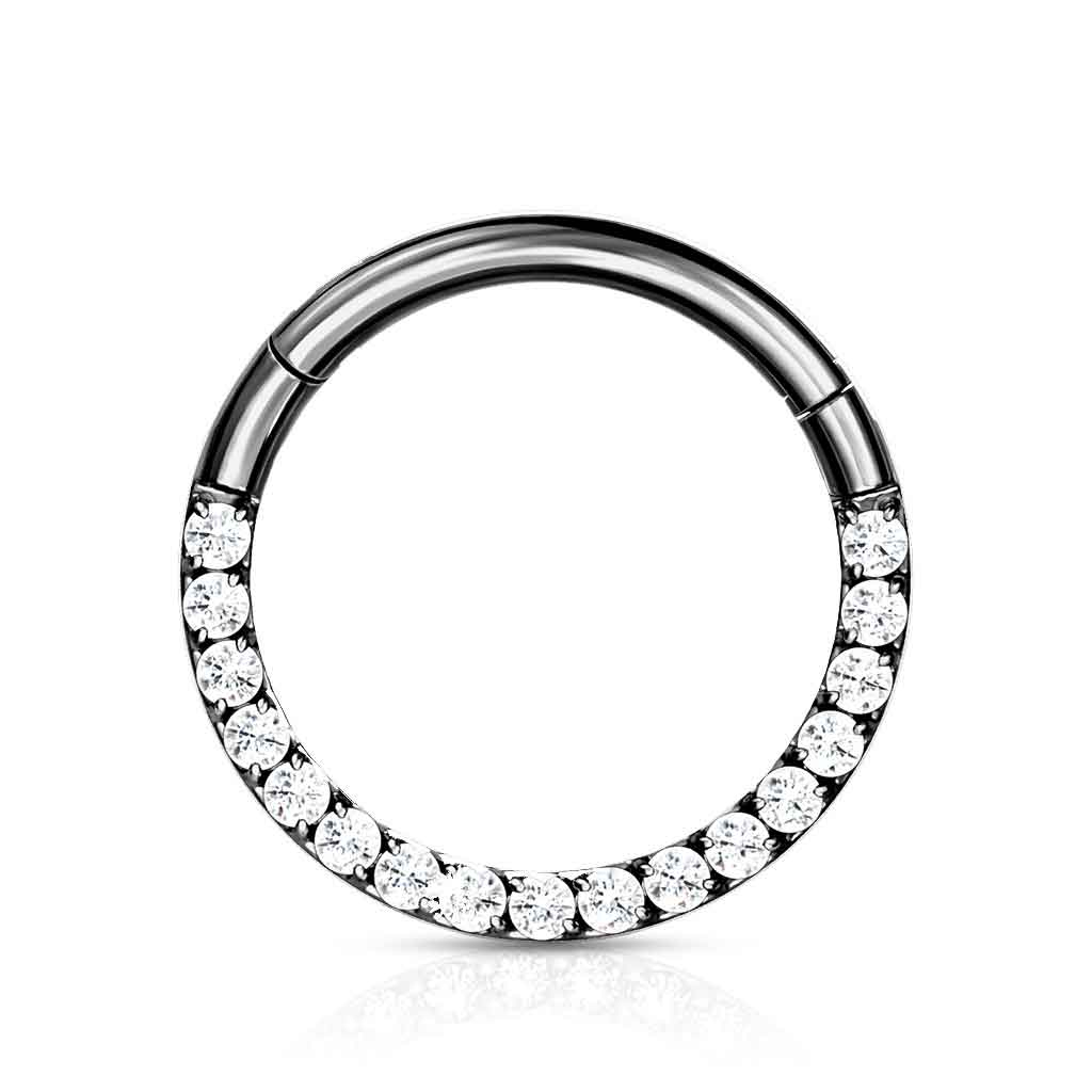 Den forreste del af ringen har en række med funklende sten. Du skal overveje placeringen af stenene alt efter hvilken piercing du vil have ringen til. F.eks. er stenene placeret perfekt til en septum eller daith piercing, men til næseborene vil du nok foretrække et design hvor stenene peger udad.
