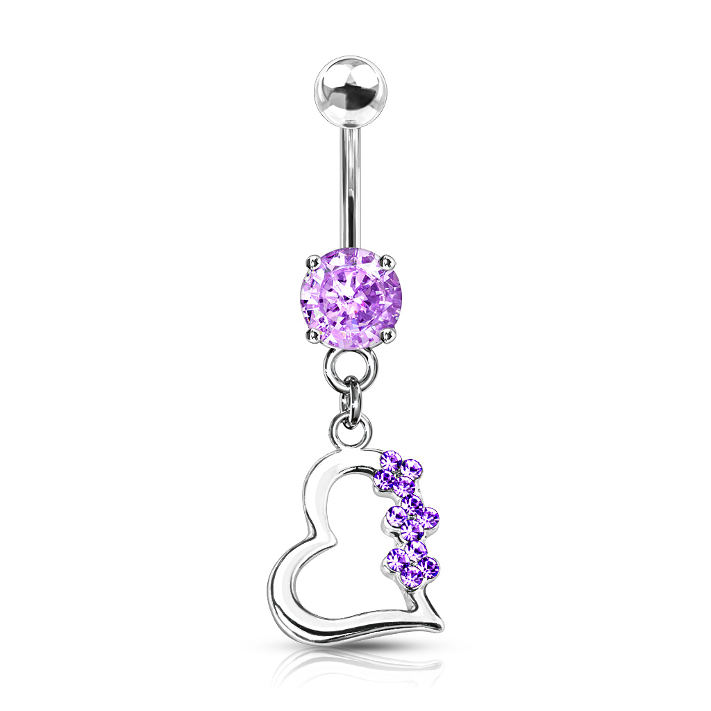 Smukt udført navlepiercing som er designet i et flot udtryksfuldt design med en glimtende sten og et flot hjerte med små farvede sten som vedhæng. Smykket fås i tre forskellife farver, du vælger blot din foretrukne farve før du går videre til bestlling.