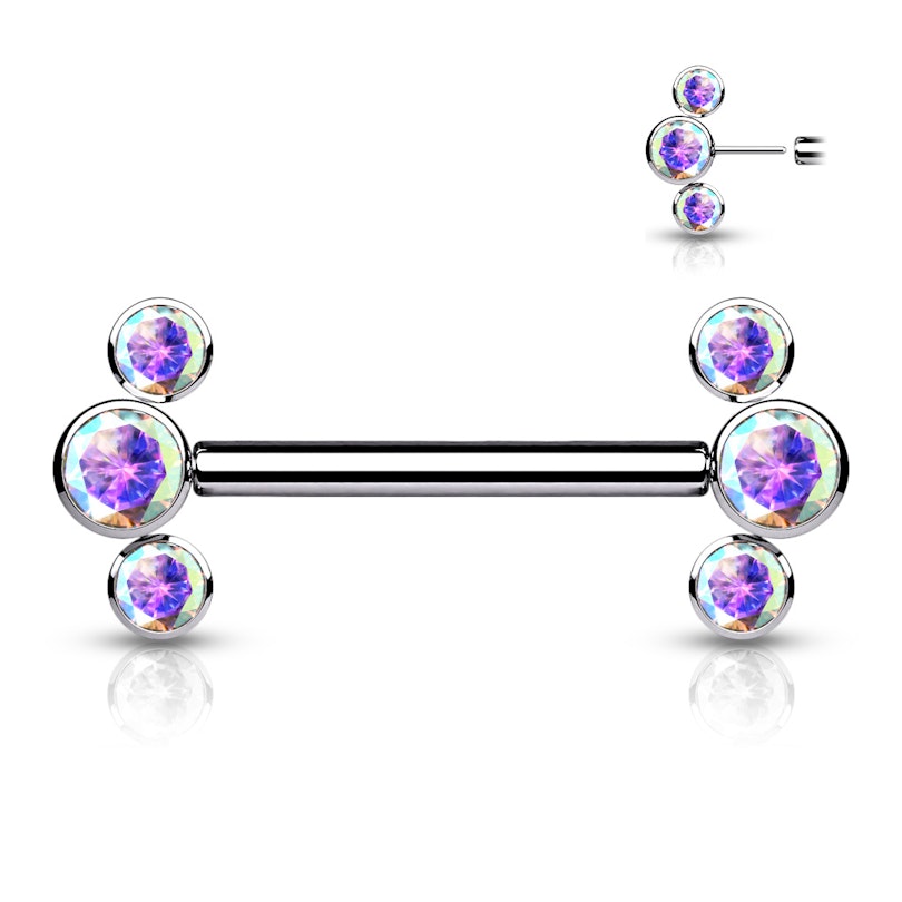 Smykket er lavet af titanium, som er et af de bedste materialer du kan byde dine bryster. De klare sten der sidder i hver ende, er kubisk zirkonia sten, som er indfattet i metallet. De større sten måler 3,9 mm og de mindre sten måler 2,9 mm. Du kan vælge mellem flere forskellige farver sten.