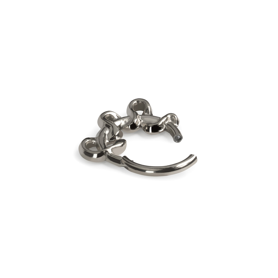 Denne hængslede ring vender udad med et slangedesign, der ser fantastisk ud i flere piercinger, inkl. septum-, conch-, daith- og rook-piercinger. Smykket er lavet af kirurgisk stål, så det er vandfast og velegnet til de fleste hudtyper. Den hængslede lås gør det nemt at sætte smykket sikkert i din piercing.