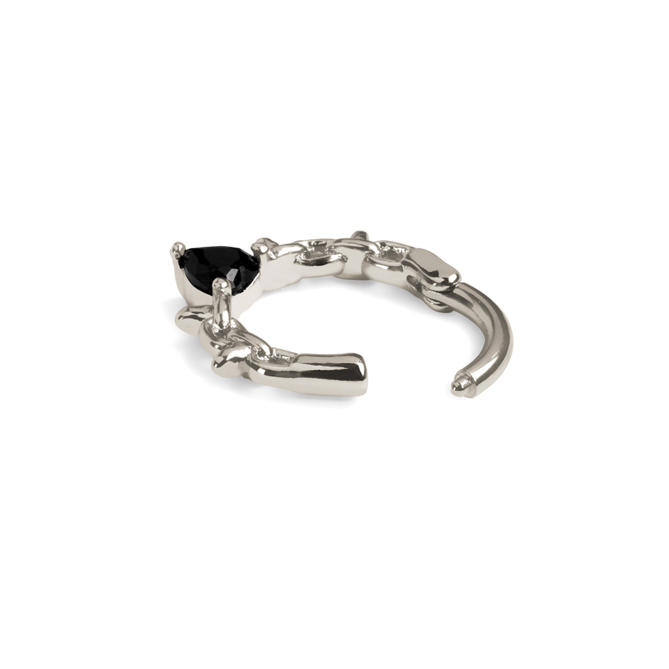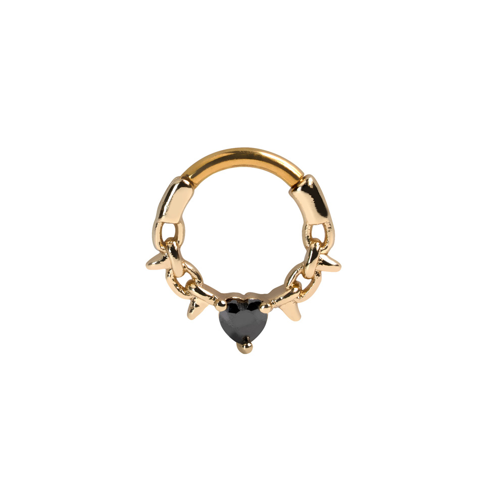 Denne ring, som vender udad, har et design af pigtråd med en sort sten i midten, der er formet som et hjerte. Da ringen er hængslet, er den let at sætte sikkert i din piercing.