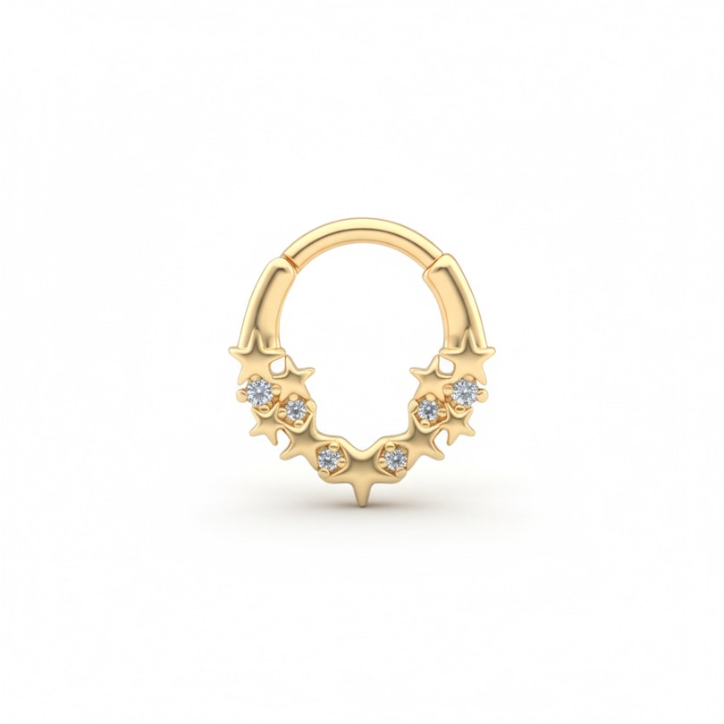 Denne ring, som vender udad, har stjerner og måner, som vil være en smuk tilføjelse til din samling. Ringens hængslede åbning gør den let at sætte sikkert i din piercing.