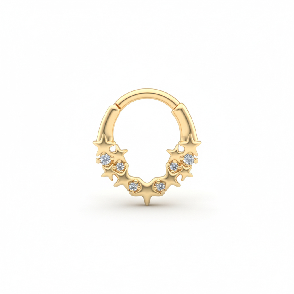 Denne ring, som vender udad, har stjerner og måner, som vil være en smuk tilføjelse til din samling. Ringens hængslede åbning gør den let at sætte sikkert i din piercing.